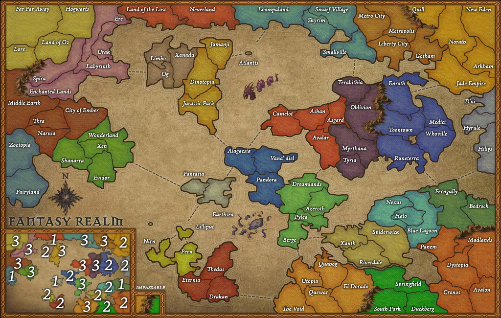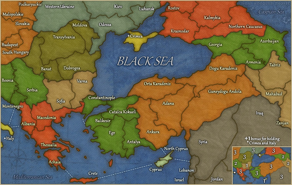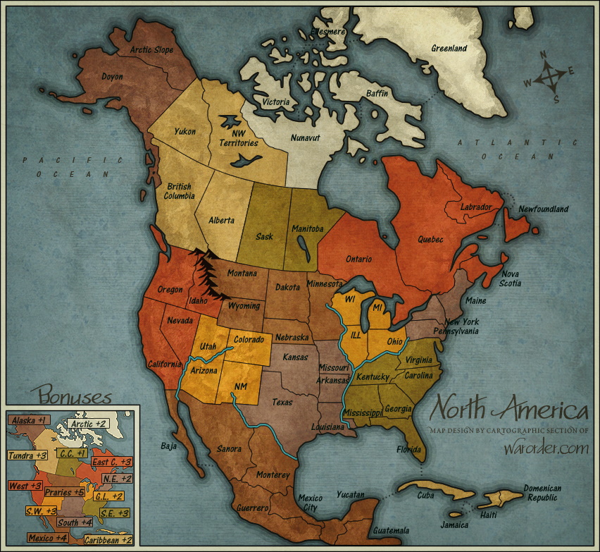 Featured on D12. Fantasy map used for a forum game (mafia/werewolf), turned into a Risk game map.